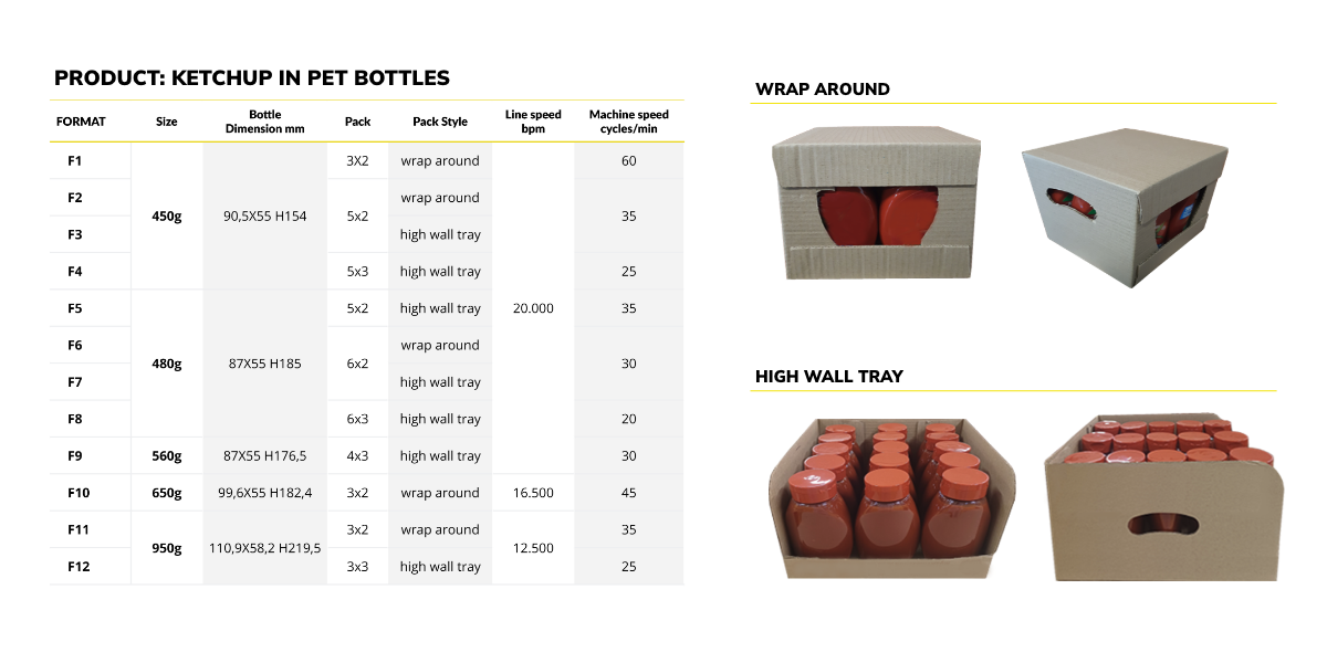 - Process 12 distinct secondary packaging configurations, including wrap-around packs and high-wall trays